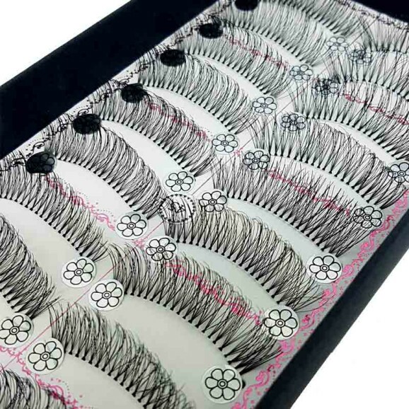 Caixa com 10 pares de cílios postiços com certas de fibra artificial.