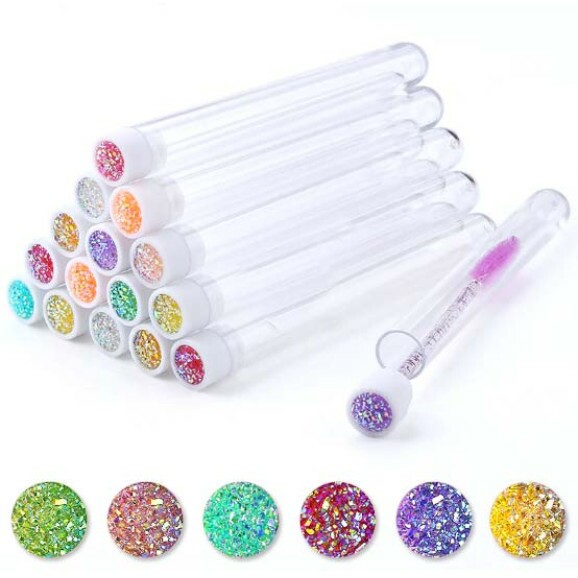 Linda escova para sobrancelha com aste enfeitada de glitter dourado.