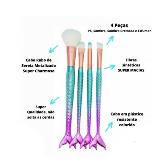 Pincéis de maquiagem cabo (cauda) de sereia, que podem ser usados para aplicação de pó, blush, contorno, corretivo e sobrancelha.