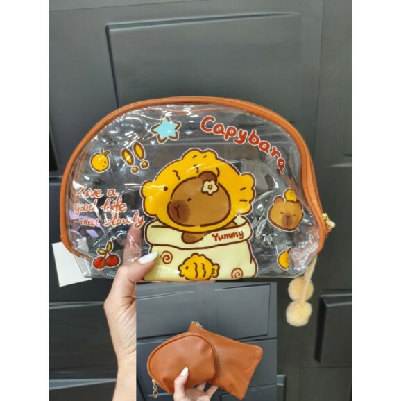 Bag super resistente e prática, a maior é de plástico incolor com imagem de capivara e as outras duas são menores de couro PU impermeável.