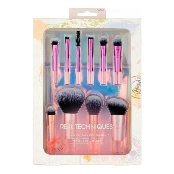Kit com 10 miniaturas de pincéis de maquiagem e 1 nécessaire. Real Techniques Travel Fantasy Mini Brush Set traz um conjunto especial com tema de viagem.