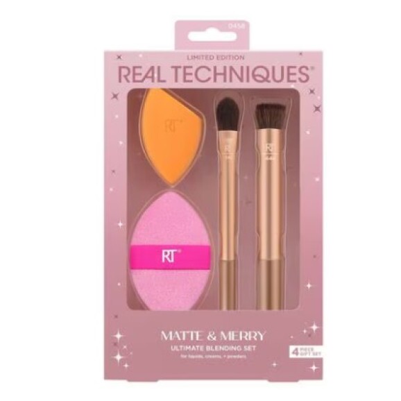 Real Techniques O conjunto de presente Matte & Merry Ultimate Blending inclui: (1) esponja Miracle Complexion, (1) Puff de pó Miracle 2 em 1, (1) pincel corretivo de pata de gatinho RT 242 e (1) pincel de bochecha filtrado RT 444 - nossas amadas ferramentas de mistura para a base perfeita