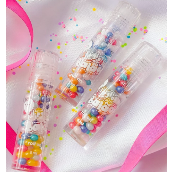 Gloss incolor com miçangas que imitam balões.