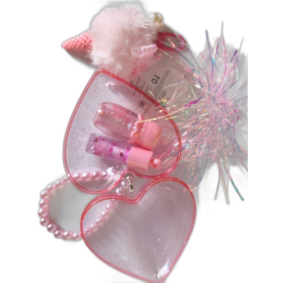 Sua embalagem encantadora de coração transparente com glitter vem acompanhada de uma pulseira de pérolas, mais um lindo chaveiro de pompom e 2 mini glosses.