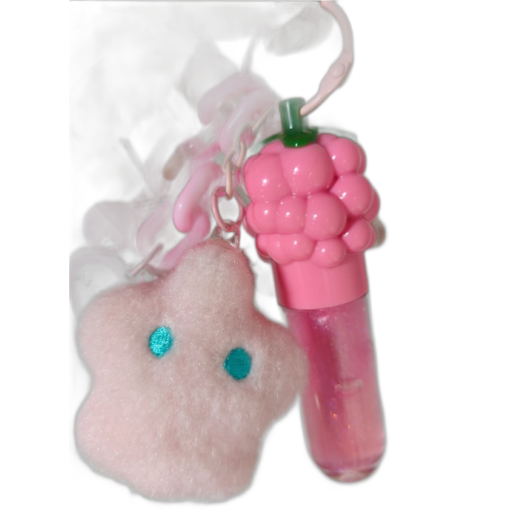 O gloss e seus pingentes fofos, possui particulas de glitter e um tom rosadinho bem claro.