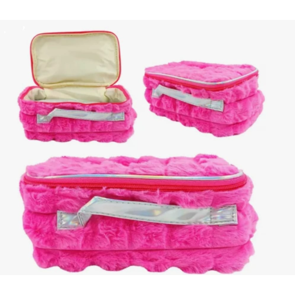 Organização e fofura para organizar as maquiagens e acessórios. Nossa maleta é toda de pelucia 100% hipoalergenica, sintética, super fofa e pelo alto, as alças são de vinil holografico.