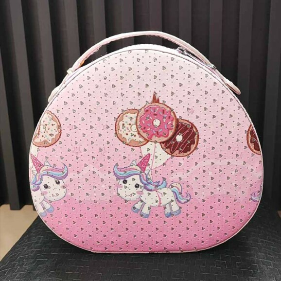 Revestimento externo: couro sintético degradê de rosas, relevo de corações de glitter prata, desenhos de unicornios com donuts.