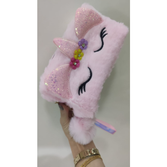 A necessaire mais linda que você já viu. Toda de pelúcia na cor rosa, bordada , com acabamentos em tecido de glitter flocado, strass e chaveiro de pompom.
