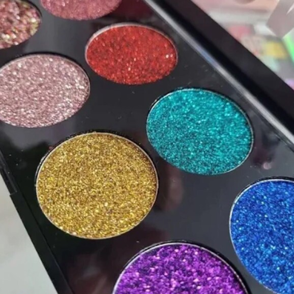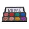Paleta de Glitter Pink 21 Brave com 8 cores extremamente brilhantes e de fácil aplicação, um dos tons possui partículas de glitter flocado em tamanhos maiores.
