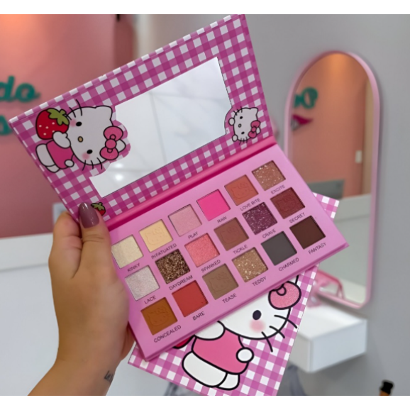 Descubra a magia da Paleta cartonada de sombras 18 cores - Hello Kitty! Com uma seleção de cores vibrantes e encantadoras, esta paleta é perfeita para criar looks deslumbrantes e cheios de personalidade.