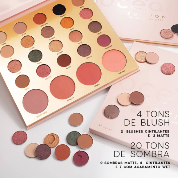 A Paleta Multifuncional Celebrate Océane Edition é uma festa! São 20 tons de sombras com diferentes texturas e acabamentos e 4 tons de blush com acabamento cintilante e matte, perfeitos para transformar qualquer ocasião.