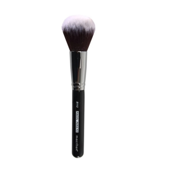 Pincel Macrilan B112, especialmente desenvolvido para aplicação de pó mineral, pó facial compacto, solto ou iluminador por toda a face e corpo. Feito com cerdas arredondadas e macias para uma aplicação suave e uma maquiagem uniforme.